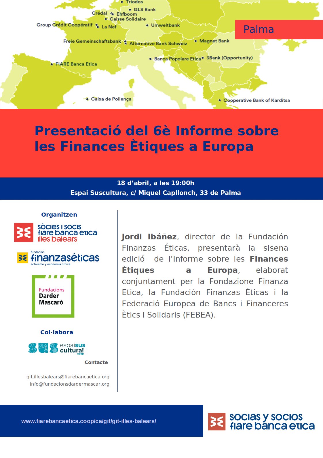 El jueves 18 de abril se presentó en Palma de Mallorca el 6º informe “Las finanzas éticas en Europa“. El informe es fruto de la colaboración entre Fondazione Finanza Etica, Fundación Finanzas Éticas y FEBEA (Federación europea de entidades de finanzas éticas y alternativas). La presentación tuvo lugar en Espai Suscultura (C/ Miquel Capllonch, 33 – Palma).