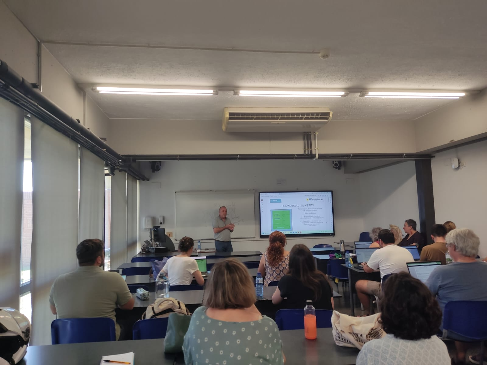 Las personas técnicas de la Fundación, Lucía Gómez, y Carles Estapé, han intervenido en distintas sesiones para acercar al profesorado los valores de las finanzas éticas, compartir experiencias y presentar el Premio Arcadi Oliveres.