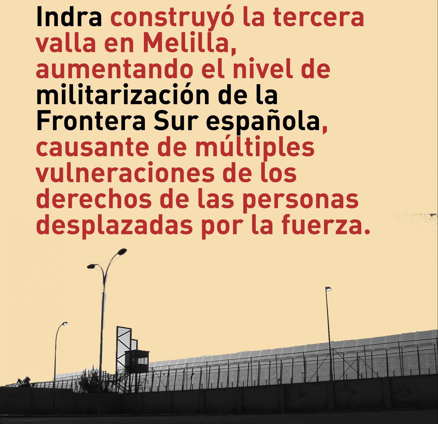 Tal y como ha trasladado Koldobike Velasco en la junta de accionistas, INDRA destaca por estar implicada en la construcción de las vallas de Ceuta y Melilla y por haber desarrollado el Sistema Integrado de Vigilancia Exterior (SIVE), un sistema de radares que puede ser utilizado para interceptar a personas migradas. Instalación que ha costad más de 230 millones de euros entre los años 2002 y 2018. La misma compañía asegura que sus sistemas de vigilancia marítima «salvan vidas», mientras solo en el 2020, según Caminando fronteras, hubo 45 naufragios con más de 1800 personas muertas en la ruta canaria.