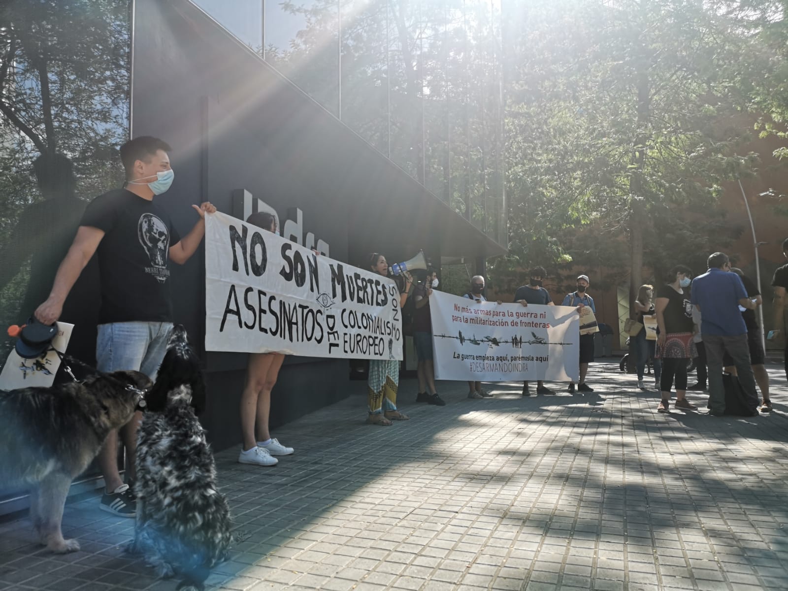 Además, después de la intervención, en la tarde, activistas de los diversos colectivos y organizaciones que hemos colaborado en el comunicado trasladado a los accionistas de Indra nos hemos llevado a cabo una acción de denuncia ante la sede de la empresa en Barcelona. “Desarmando Indra” es el lema usado en esta campaña.