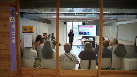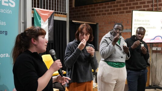 La jornada del sábado puso el acento en la dimensión propositiva y pedagógica. Diversas entidades de finanzas éticas compartieron su funcionamiento y sus principios —basados en la transparencia, la gobernanza democrática, el arraigo territorial y la orientación al bien común— y se presentaron experiencias educativas impulsadas desde el propio profesorado. La tarde se articuló en talleres simultáneos que ofrecieron recursos prácticos para trabajar en el aula temas como la fiscalidad justa, la banca armada, la desinformación, la tecnología abierta o las finanzas éticas y economía solidaria.