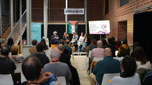 La primera jornada se abrió con una reflexión sobre la educación para la justicia económica global en un contexto de auge reaccionario. Moderada por Mariano Flores (Edualter), la primera mesa contó con intervenciones de Cecile Barbeito (Escola de Cultura de Pau) y Koldobi Velasco (Grupo Animilitarista – Banca Armada. Ambas pusieron en relación economía, violencia estructural y militarización. En este marco, se subrayó la importancia de revisar críticamente los marcos culturales y los relatos que sostienen el modelo económico dominante, así como de trabajar desde la educación los consensos sociales existentes y la reducción de las desigualdades.